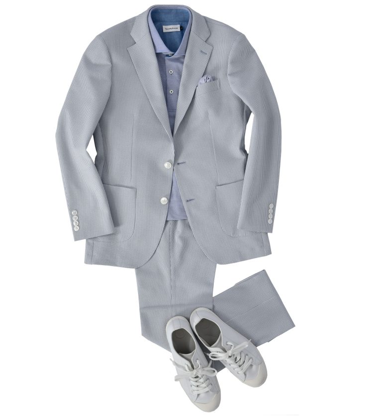 ZIGNONE が展開する夏向けの機能性生地「ACTIVE」で使用されているシアサッカー生地、生地表面のシボが特徴で肌に張り付かず涼しくストレッチ性もありオンオフ問わず快適に着用できる夏場の代表生地です。